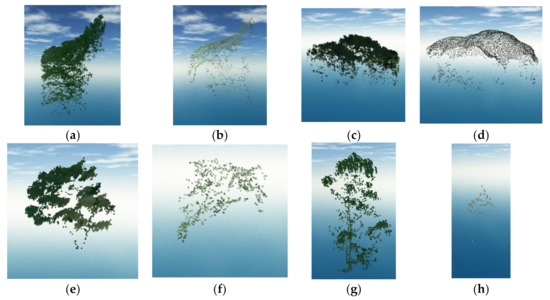 3D models by the spherical harmonics fitting method of (a) the first tree sample using the LiDAR method, (b) the first tree sample using the photogrammetric method, (c) the second tree sample using the LiDAR method, (d) the second tree sample using the photogrammetric method, (e) the third tree sample using the LiDAR method, (f) the third tree sample using the photogrammetric method, (g) the fourth tree sample using the LiDAR method, and (h) the fourth tree sample using the photogrammetric method.
