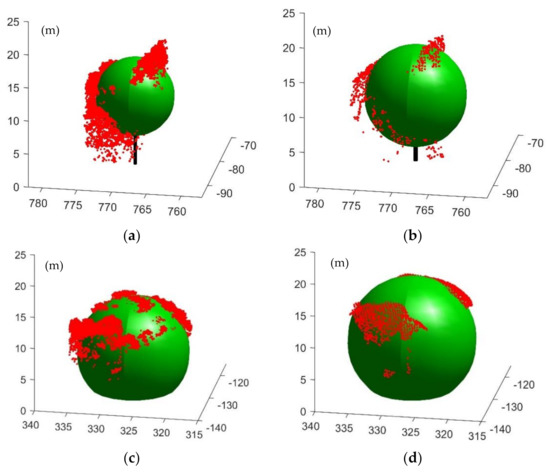 The R2 value of the sphere fitting ranges from 0.002 to 0.029. This value is negligible and indicates that 3D modeling using the sphere fitting method is not recommended. This is because the sphere fitting cannot accommodate various canopy shapes. For example, in sample tree 1, the shape of the leaves that extends upward cannot be modelled. In addition, in the second tree model, in the form of the tree extending to the side, the resulting canopy model exceeds the lower limit of the formed trunk model, as seen in Figure 9.