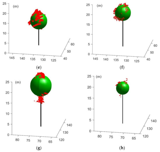 3D model by sphere fitting method of (a) the first tree sample using the LiDAR method, (b) the first tree sample using the photogrammetric method, (c) the second tree sample using the LiDAR method, (d) the second tree sample using the photogrammetric method, (e) the third tree sample using the LiDAR method, (f) the third tree sample using the photogrammetric method, (g) the fourth tree sample using the LiDAR method, and (h) the fourth tree sample using the photogrammetric method.