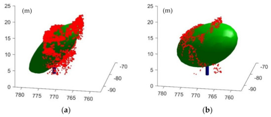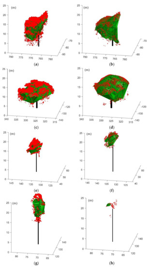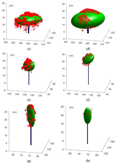 3D model by ellipsoid fitting method of (a) the first tree sample using the LiDAR method, (b) the first tree sample using the photogrammetric method, (c) the second tree sample using the LiDAR method, (d) the second tree sample using the photogrammetric method, (e) the third tree sample using the LiDAR method, (f) the third tree sample using the photogrammetric method, (g) the fourth tree sample using the LiDAR method, and (h) the fourth tree sample using the photogrammetric method.