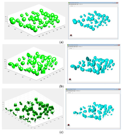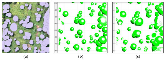 Comparison between (a) manual tree digitization results with (b) top view of modeling with LiDAR data and (c) top view of modeling with photogrammetric data.
