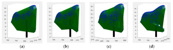 Alpha shape is a heuristic approach and performs well in uniform sampling. However, the optimal value of alpha is on the sampling density, which continuously changes at different parts of the surface [49]. In the alpha shape and robust crust methods, the form of the surface more closely follows the shape of the point clouds, which has implications for the number of vertices and a more significant number of faces. There are differences in the volume calculations generated from the surface from LiDAR data and photogrammetric data. Using LiDAR data, the resulting volume ranges from 600–700 m3, while photogrammetric data ranges from 800–900 m3. There is a significant difference because the point clouds produced by the photogrammetric method are only at the top of the canopy, so the model generated at the bottom of the canopy is not formed perfectly, resulting in a different modeling form from the surface generated from LiDAR data. The number of vertices, faces, and volumes generated for each surface reconstruction method can be seen in Table 5.
