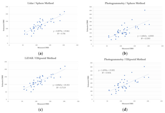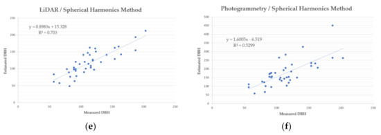 Scatter plot of measured DBH value from field validation with estimated DBH value (a) sphere modeling with LiDAR data, (b) sphere modeling with photogrammetric data, (c) ellipsoid modeling with LiDAR data, (d) ellipsoid modeling with photogrammetric data, (e) spherical harmonics modeling with LiDAR data, and (f) spherical harmonics modeling with photogrammetric data.