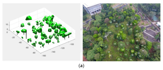 In this study, DBH calculations were carried out because height calculations would be difficult to validate. This is because the trees in the area studied have a height in the range of 10–25 m, so it is complicated to conduct a field survey to obtain an appropriate and accurate height value.