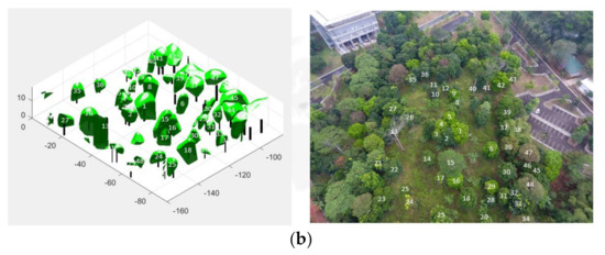 Comparison between the results of 3D modeling of trees using a spherical harmonics method on (a) photogrammetric data and (b) LiDAR data with the actual situation in the field visually.