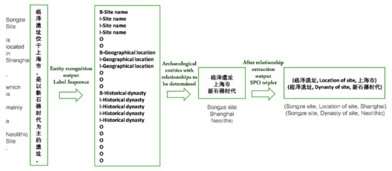 As per the relationship between the above four archaeological entities, we have defined four archaeological relationships, namely: Culture of the site, Location of the site, Dynasty of the site and None. In the process of carrying out information extraction experiments, it is primarily divided into two parts. Initially, the archaeological text is input into the named entity recognition model sentence by sentence. The trained model can identify archaeological entities of preset categories and output sentences containing entities. Then, the above outcome is input into the relationship extraction model, which finally obtains the entity relationship triplet (e1, r, e2), also known as “SPO triplet (subject, predicate, object)”. For instance, the demonstration of information extraction on archaeological site text is shown in Figure 1.