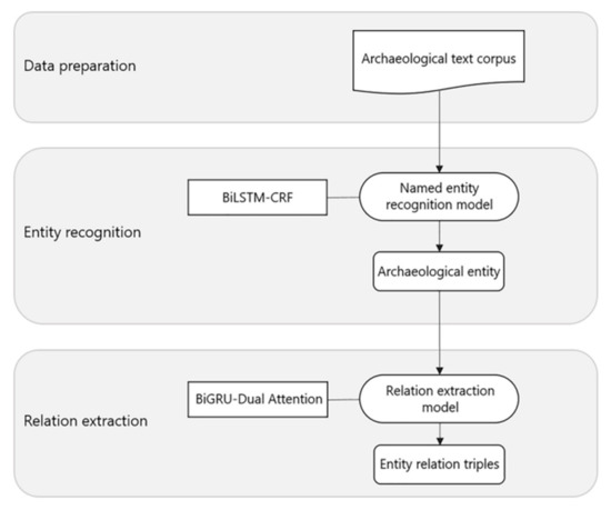 Named entity recognition is an essential assignment of extracting information. It refers to recognizing target entities in the text and classifying them as indicated by pre-defined criteria. In the experiment, the BiLSTM-CRF model is used for named entity recognition in Chinese archaeological site texts, which provides a novel thought and method for entity recognition in the field of Chinese archaeology. Entity relationship extraction means that after recognizing the vital entities in a sentence, the semantic relationships that exist between the entities are determined. Consequently, in light of entity recognition, this paper constructs a BiGRU-Dual Attention model for archaeological site texts. This model uses BiGRU to learn the contextual information of words to obtain finer-grained features. Through the word-level attention mechanism can increase the weight of words that are conclusive for relation classification. Simultaneously, using the sentence-level attention mechanism, we can learn more features of sentences and diminish the weight of noisy sentences, thereby effectively solving the problem of mislabeling and improving the effect of the classifier. The overall method process of this paper is shown in Figure 2.