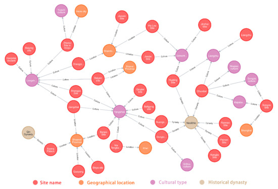 Under the advancement of computers and the Internet over the years, it can be seen that knowledge graph technology has drawn extensive attention. Knowledge graphs have natural advantages for the analysis, display and utilization of the results of information extraction. As the structured semantic knowledge base, knowledge graphs can effectively process, handle and integrate massive amounts of information. Information extraction based on structured triples is an important step in the process of constructing knowledge graphs. After the above information extraction experiment, we obtain the triples from the archaeological site texts. By storing the triples in the relational database, we can obtain a basic knowledge graph and complete the transformation from unstructured texts to structured texts. In line with the knowledge graph construction process, the development and storage of archaeological site knowledge graphs are realized based on Neo4j. The graph contains 3318 nodes and 8120 edges in total. Figure 5 shows a partial knowledge graph of archaeological sites. Fundamentally, this paper aims to extract structured spatio-temporal information from various archaeological textual data and formalize them with a unified triplet representation. They support graphical query language access, so that deep knowledge can be obtained. The introduction of knowledge graphs is relatively new, and few studies have explored their application in the field of archaeology. In the future, we envisage linking archaeological site knowledge from different resources, and the utilization of these interrelated knowledge will further strengthen the discovery of archaeological knowledge. By constructing the archaeological site knowledge graph, it not only enriches archaeological site knowledge but also popularizes archaeology for the public. Meanwhile, it can establish the foundation for subsequent applications such as the semantic search for archaeological knowledge and intellectual question and answering.