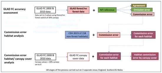 The commission error grids from the accuracy assessments were combined with 2015 CEH habitat data. The resultant habitat-classed commission error grid was combined with the GLAD FC percentage canopy cover, as summarised in Figure 1.