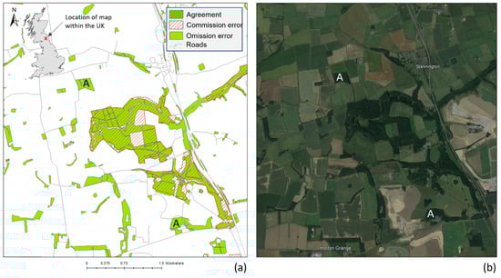 The OS 2019 MMU is <10 m2, which is considerably smaller than the Corine and CEH MMU of 250,000 m2 and 5000 m2, respectively. This difference causes an omission error of nearly 50% when the OS 2019 data are compared to the Corine 2018 and illustrates the potential for large inaccuracies when using low-resolution land cover datasets in areas with small land parcel size. Figure 2 compares the two datasets over a small area in the north of England, with the Google Earth image further demonstrating the small parcel size of woods captured in the OS 2019 data that are absent in Corine 2018 (A).