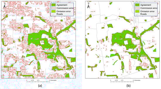 Accuracy maps for (a) 2010 NFI (reference in green) vs. 2010 GLAD FC, (b) 2010 NFI vs. 2000 GLAD FC. (location within the UK the same as Figure 2).