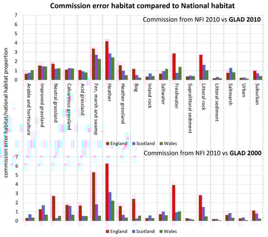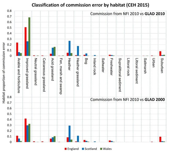 It can be seen that in England and Wales, the habitat classification with the highest commission error is the land cover class Improved grassland (pasture), whilst in Scotland, the Heather land cover class has the highest error. Approximately 70% of that land cover class was falsely labelled as “Forest” in the GLAD 2010 data. This illustrates that classification errors were not only confined to heathland habitats but, overall, were more prevalent in improved grassland habitats.