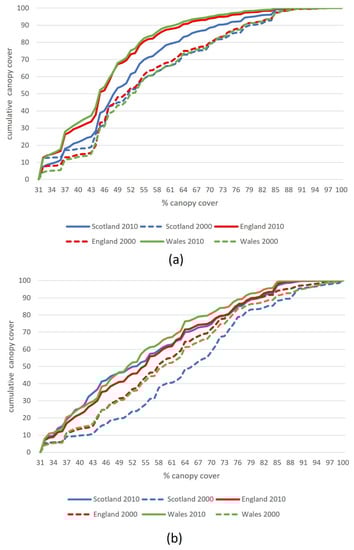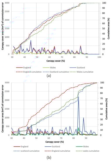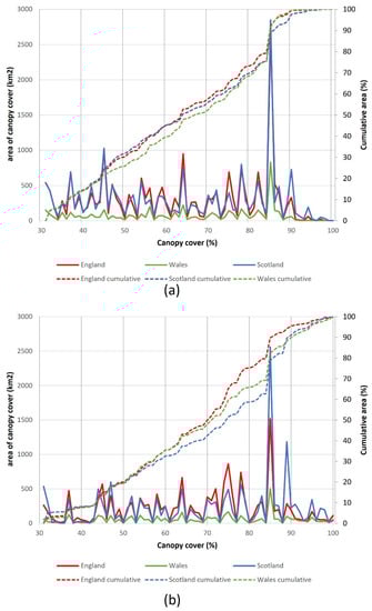 Research in the context of tropical environments showed the level of canopy cover that is used as the threshold for GLAD forest data can have a substantial effect on the accuracy [11,13]. This study tested if this was also the case for temperate environments. This was completed by graphically illustrating the area of canopy cover for the full range of percentage canopy cover. Figure 6 illustrates that for the 2010 GLAD FC, there was only a small area of the UK with canopy cover above 90%. More than 70% of the forested area had canopy cover between 30 and 85%. These results were consistent across the three nations. The distribution of canopy cover over the 2000 GLAD FC showed substantially less area with canopy covers below approximately 40% and an increase in areas with canopy cover over 90%.
