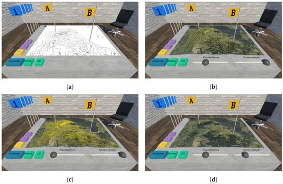 Example of a map in CIVE. (a)—2D blank map with contour lines; (b)—3D model with contour lines; (c)—3D model with changed contour lines interval by the Equidistance slider; (d)—cross-section of the highest parts of the terrain. On the table—There are purple buttons 1, 2, 3 for different terrains on the left, a blue “Evaluate” button to evaluate visibility between flags A and B, a green “Blank/Ortho” button to switch blank map with orthophoto map, a green “2D/3D” switch button, an “Equidistance” slider for the dynamic setting of contour equidistance, and a “Cross-section” slider to cut upper parts of the terrain.