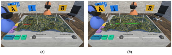 For the purposes of this study, one task was performed—the so-called Mirror Signals [29]. Participants were placed into a virtual environment in front of a table with a map and two fixed flags marking start point (A) and endpoint (B). Five more flags were prepared next to the map (numbered 1, 2, 3, 4, 5) that could be picked up and transferred to it. The aim was to connect start point A with endpoint B using the extra flags while maintaining direct visibility from the start point to the endpoint—in such a way that mirror signals can be transmitted. The intention of the task was to use as few additional flags as possible. Figure 2 illustrates examples of right and wrong startpoint-endpoint connections.