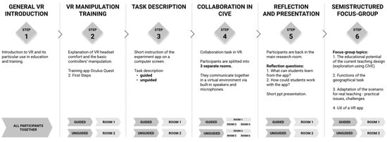 Participants—the domain experts—volunteered to attend the collaborative, interactive part of a VR workshop during the Geography Summer School at Masaryk University in Brno in August 2021. Afterward, they underwent a six-step procedure: 1. A general VR introduction; 2. VR manipulation training; 3. Task description (different for each group based on its method); 4. Collaboration in CIVE; 5. Reflection instruction and presentation; 6. A semi-structured focus-group. The procedure for both groups took, on average, two hours.