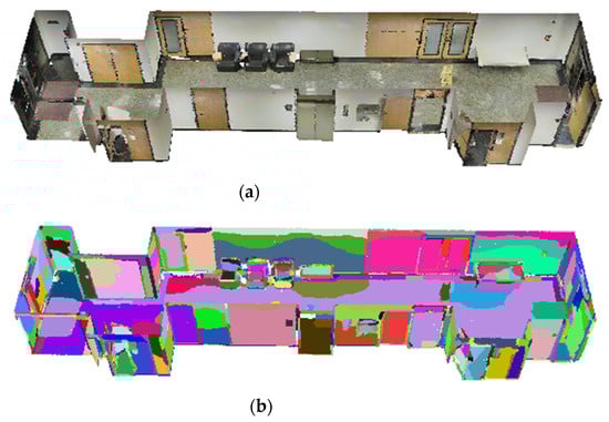 In the reconstruction of indoor environments, laser scanning point clouds have been generally used, providing high-precision and rich spatial information for the next Building Information Modeling (BIM) []. Nonetheless, effective semantic segmentation should be conducted before retrieving geometric entities. It can boost better scene understanding and high-accuracy, entity-based modeling [,].