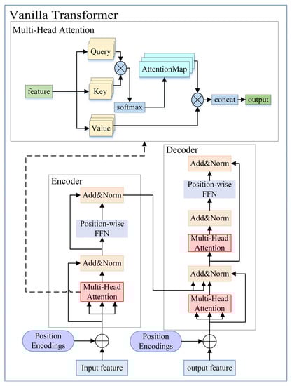 To deal with the neglected important information in the local convolution operation induced by the PointNet, the Transformer with a self-attention mechanism that pays attention to the region with rich information can be adopted as a novel feature learning algorithm. We first review the self-attention mechanism applied by the most famous vanilla Transformer [] (see Figure 2) in the machine translation field. Given an input feature, self-attention linearly projects the input feature into a query matrix , a key matrix , and a value matrix , which can be formulated as: