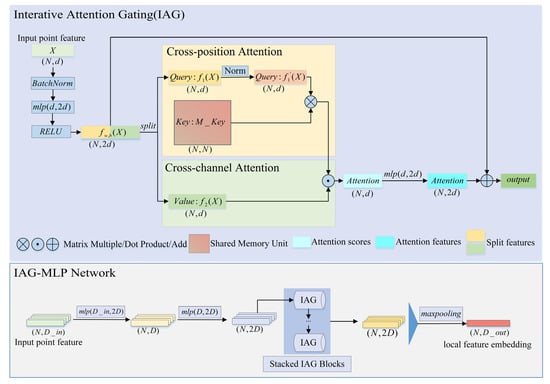 The proposed local feature aggregation module. The bottom panel illustrates the Interactive Attention Gating (IAG)–multilayer perceptron (MLP) Network for local feature encoding in preprocessed superpoints. The top panel illustrates the kernel IAG block, which exploits the dual cross-attention mechanism to compute the cross-position attention weights by a shared memory unit and operate the cross-channel attention on the feature channels, constructed as a variant of the self-attention module.