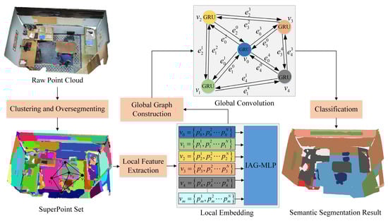For a large-scale indoor scene, the spatial topological relations between different types of objects can be utilized as object-level contextual information to globally ameliorate the embedding representation. In order to improve the performance of semantic segmentation with segment-level contextualization aggregation, the graph convolution derived from the Edge-Condition Convolution (ECC) [] would fuse superpoint-level embedding features and contextual information in the global graph for progressively updating semantic segmentation inference. Hence, in this work, we propose an end-to-end superpoint-based semantic segmentation network that firstly clusters geometrically and physically homogeneous points as intermediate representations as well as superpoints for extracting local features within the IAG–MLP local network, and then constructs the global SuperPoint Graph (SPG) for hierarchically and globally updating embedding representations with connected edges.