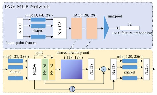 However, when it applies to point cloud processing, due to its high computational burden with dot-product attention calculation among points in each encoder or decoder layer, it is infeasible to directly implement the stacked encoder-decoder mode on massive point clouds. Furthermore, since the high dimension is indispensable to better high-level representation, separately using a linear combination of pairwise values as self-attentional weights to ameliorate input features in each feature channel may augment memory consumption in the high dimension. Therefore, inspired by both the vanilla Transformer and gMLPs [], we propose a novel IAG–MLP network directly oriented to superpoints, which can automatically impact and encode the embedding representation of each superpoint with a lightweight interactive-attention gating architecture.