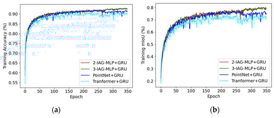 Based on the corresponding numerical results in Table 1 (left panel), we can see that although PointNet achieved the best OA with 64.13%, it presents the lowest IoU compared with other networks in terms of local embedding blocks. Theoretically, large objects such as walls or floors commonly take up a great proportion of the building’s interior, and the OA metric is generally dominated by large objects, containing a large quantity of points, while the mIoU is closely related to all categories. Consequently, we could conclude that dual attention-based networks are more sensitive to small targets than PointNet because most of the stacked IAG–MLP networks show better performance than the other two methods in mIoU, indicating better capability to distinguish multiple classes, especially suitable for indoor environments with complex architectural structures and distinctive equipment. Specifically, Figure 7a presents the semantic segmentation metrics curves in different stacked IAG–MLP networks, and they indicate that as the stacked IAG block increments, the IAG–MLP with fewer IAG blocks induced underfitting while the IAG–MLP with more IAG blocks shows overfitting, which contributes to the optimal 2-IAG–MLP outperforming the other networks in mIoU. On the other hand, the traditional vanilla Transformer underperformed stacked IAG–MLPs in both OA and mIoU in that the cross-attention utilized in IAG–MLP captures high-order relationships across channels other than self-attention.