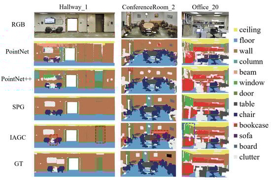 Generally speaking, our proposed IAG–MLP presents competitive performance on the local representation embedding task compared with common pointwise convolution networks, and the combination of local IAG–MLP and global graph convolution networks even outperforms other MLP-based or Transformer-based networks on the semantic segmentation task. Accordingly, we attribute these improvements to two underlying factors. First of all, IAG–MLP executes an interactive-attention mechanism where the embeddings can be dominated by the augmented features from the combination of multiple feature channels in the dot-production enhanced procedure, which is beneficial to objects that show distinctive geometry-based and color-based characteristics (i.e., chairs, sofas, and tables). Because of the high-order features spread across the high-level feature channel, objects with similar geometry but different colors from the surrounding objects (i.e., board and window) and objects with similar color but different geometry (i.e., beam and column) can be clearly distinguished. In addition, the distinctive representations derived from the IAG–MLP network further facilitate interaction of contextual information among superpoints. In practice, it distinguishes the floor from the ceiling by considering the effect of the adjacent objects such as indoor furniture and surrounding walls. In contrast, the floor and ceiling may mutually enhance the segmentation of indoor furniture. Overall, our proposed IAGC generates more distinctive features for complicated objects and better handles permanent structures thanks to the interactive attention module.