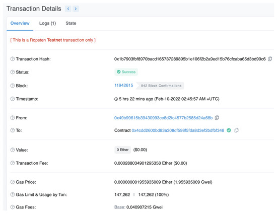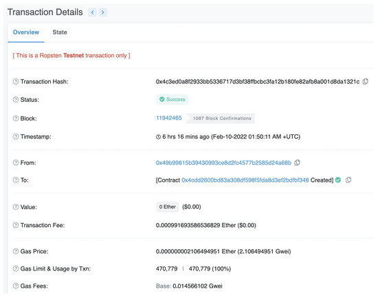 The deployed smart contract was recorded in block 1 and the first measured coordinate is the Table 2 and Table 3. Subsequently, Algorithm 4 was executed 56 times to execute a total of 56 additional transactions (Figure 4).