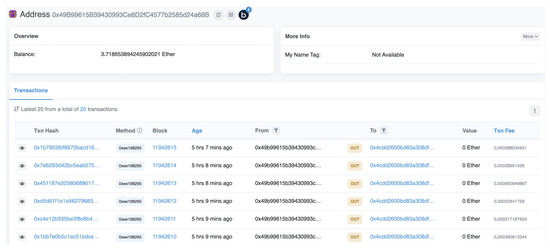 Reliability: it was confirmed that reliability was improved by allowing anyone to prove GPS data using hash values on the blockchain. In this study, the transaction hashes occur for each Algorithm 4, and NMEA and RTCM data are stored (Figure 7). Therefore, even if a user reports a result in the form of a file, data can be tracked using only the transaction address. The algorithm proposed in this study distributes one contract to one location to be measured, and generates one transaction per point (Figure 8). When the system is executed to produce 60 surveys at one point, 60 transactions occur, and are connected to one contract address. In the past, if only one point could be received as a final result, the contract address could be used to track whether regulations, such as overall data, and survey working hours for one location could be observed (Figure 9). Wallet addresses can distinguish between workers. All transactions and contracts that occurred can be queried, so that all of the surveyed behaviors of the workers could be tracked (Figure 10).