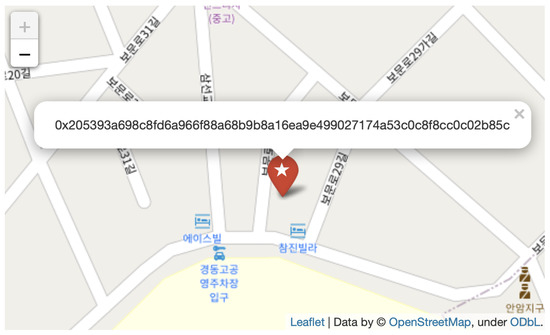 The last recorded coordinates are seen in Table 4 and Table 5. Algorithms 1–3 were executed to see the value recorded in the contract. It was confirmed that the measured coordinate and the value recorded in the Ethereum network matched (Figure 5).