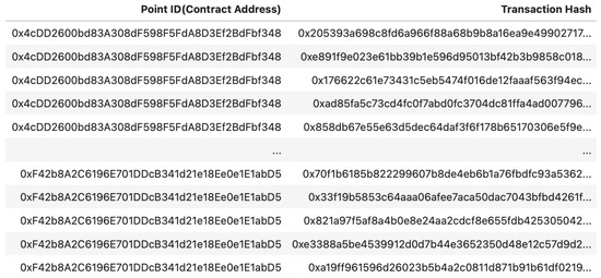 Transactions have several attributes: transaction hash refers to identifiers; contract addresses refer to survey points and survey processes; wallet addresses refer to surveyors; and data refer to NMEA and RTCM data. Unlike the traditional system, the entire process, other than the final result, can be checked for compliance with regulations pertaining to issues, such as survey time, and the work of surveyors can be traced (Table 1). Using this approach, even if a value in the system is manipulated, anyone can inquire about the transaction hash to perform integrity checks and track the original data.
