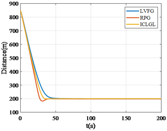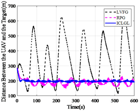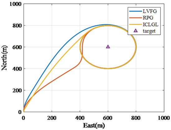 The performance of ICLGL is compared with that of LVFG [11] and RPG [28] for tracking a static target. It should be noted that the ICLGL and RPG give the roll angle command signal while the LVFG gives the heading angle command signal. The desired standoff radius is 200 m.