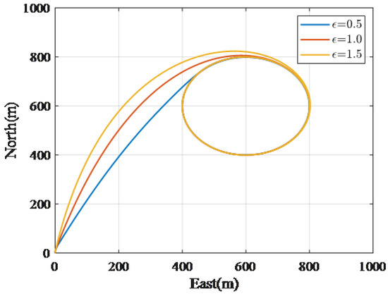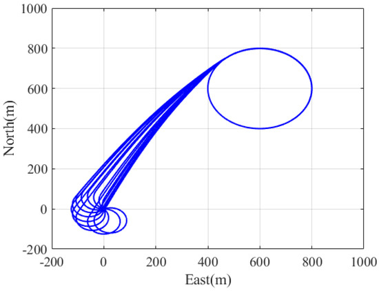 The simulation results of tracking the static target located at are given in Figure 6 and Figure 7. The simulation results show that RPG and ICLGL converge to circular trajectory faster than LVFG. To show the stability of the ICLGL, we construct simulations under different initial heading conditions. The UAV started with the heading angle of and the results are shown in Figure 8. The results for while are shown in Figure 9. We can find that the smaller the value of , the faster the convergence speed.