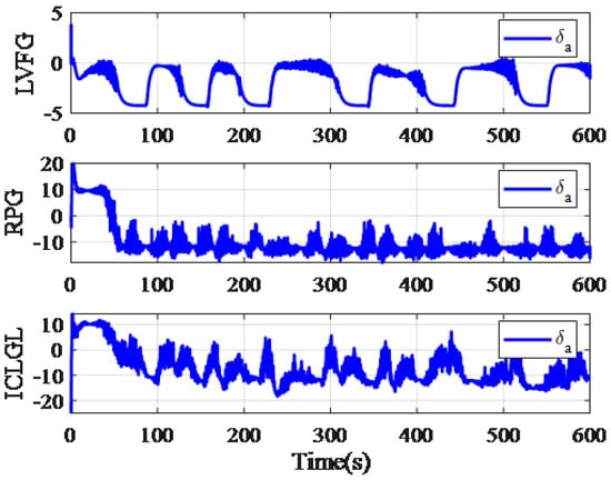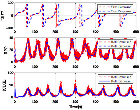 Figure 11 shows the trajectory in horizontal plane. From Figure 12, we can find that the RPG and LVFG do not converge to the required tracking radius. When using the LVGF method, UAV will get too close to the target, which is very dangerous. On the other hand, when using ICLGL, the distance can converge to the desired tracking radius. Figure 13 shows the guidance signal and response. From Figure 14 we can find that the deflection of the aileron is within a reasonable range. It should be noted that it takes time for the UAV to respond to the command, the relative distance between the UAVs and the target will oscillate and cannot converge to the expected tracking radius, but the maximum deviation is less than 30 m. In summary, the ICLGL is more accurate and effective in tracking moving targets compared to the LVFG and RPG.