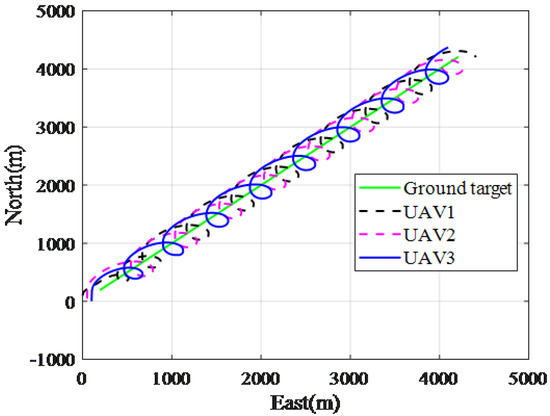 Unmanned Aerial Vehicles (UAVs) are increasingly used in battlefield reconnaissance, suppressing enemy air defenses, attacking ground targets, and dominating battlespaces [1]. The development of microcomputer technology has allowed modern UAVs to become comprehensive and intelligent [2]. Autonomous target tracking is one of the most important problems in the autonomous navigation of UAVs [3,4]. The UAV must maintain a certain distance from the target for the observation distance limitation of the sensor and the threat of the target, but the moving speed of the ground target is much slower than that of the fixed-wing UAV, which makes it difficult to realize. Therefore, it is of great significance to study autonomous target tracking methods to enhance the effectiveness of the UAV [5].