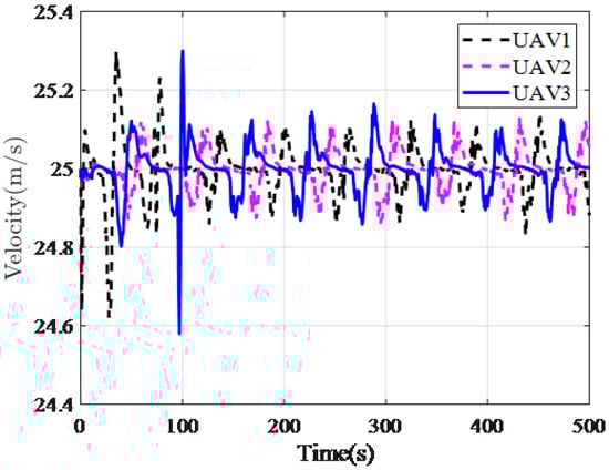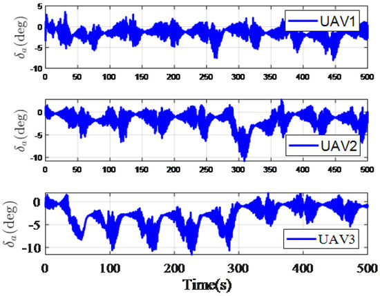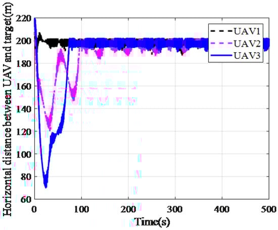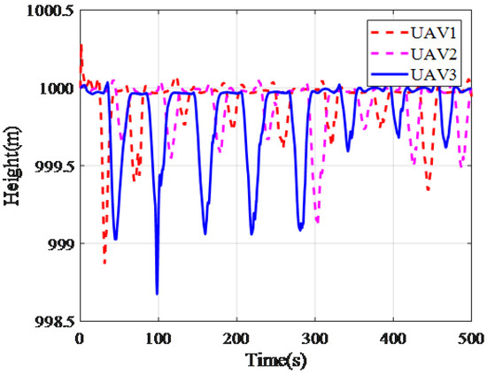 Given that a target moved along a straight trajectory with the start point (200 m, 200 m, 0 m). Three UAVs performed the mission of target tracking, and the initial positions were (0 m, 0 m, 1000 m), (0 m, 100 m, 1000 m), and (0 m, −100 m, 1000 m), respectively. Figure 15 shows the paths of the UAVs. From Figure 16, we can find that three UAVs converge to the required tracking radius R. Figure 17 shows the deflection of the aileron and Figure 18 shows the phase difference between UAV1, UAV2, and UAV3, which oscillates around the required phase . Note that the ICLGL only controls the lateral factor, the velocity and height of three UAVs do not change, as shown in Figure 19 and Figure 20. The simulation results indicate that the coordinated guidance law based on ICLGL can solve the problem of coordinated target tracking.