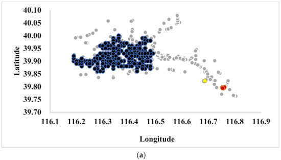 Density-Based Spatial Clustering of Applications with Noise (DBSCAN) is a classic density-based algorithm. Since the DBSCAN based method can accurately extract high-density points in the location data set, it is effectively used in hotspot mining. In order to explore the impact of clustering on the road network structure [27], Schoier used the classic DBSCAN clustering algorithm to perform a cluster analysis on the urban area of Trieste (Italy) to understand the structure of the road network from the “dense” areas of the location point. However, whether the clustering results of this algorithm are meaningful to real users has not been evaluated systematically. In response to this problem, Zhou proposed an improved density and connection-based clustering algorithm for mining hotspots that are meaningful to individuals [28], and the author proves that results from the algorithm has practical meaning by collecting real user data, but this method only considers the spatial size and ignores the time series features. Hwang took the spatial-temporal characteristics into consideration and used linear interpolation to fill in the position points that did not meet the spatial density and duration measurement criteria. A DBSCAN spatial clustering algorithm considering time criteria and intervals was proposed to detect urban hotspots [29]. When calculating the density of GPS points, many clusters mainly consider the number of GPS points within a given distance rather than their corresponding characteristics. Luo et al. used a Gaussian function to measure the density by the number of points within a certain distance from the current point instead of the density calculation method of the current point in the DBSCAN algorithm. A DBSCAN clustering algorithm based on mixed features was proposed [30] which first defined the new concept of mobility; clustering area should have lower mobility and higher GPS point density, each location point is affected by the interaction with other points, and more accurate clustering results can be obtained.