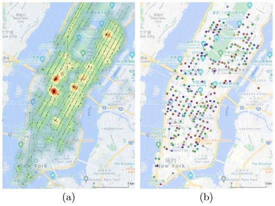 Spatial distribution of one hour’s taxi order data in New York City (a) and virtual stations discovered by clustering (b). Each dot in (a) represents a taxi order origin and the underlying heatmap highlights the hot spots in the city.