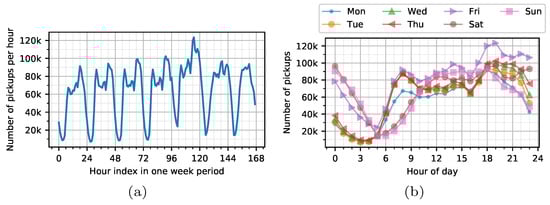 Benefiting from the wide deployment of GPS sensors in taxi vehicles, a large amount of taxi trip data have been collected, which brings opportunities to design more powerful data-driven models to improve the accuracy of taxi demand forecasting. However, taxi order data in real-life scenarios generally follow complex spatial-temporal patterns [,]. Figure 1a shows an example of the spatial distribution of one hour’s taxi orders in New York City (NYC). It can be observed that the orders also tend to gather around hot spot areas in the city. The temporal distribution of the taxi orders is visualized in Figure 2 where the hourly demand is temporally correlated and contains both short-term and long-term periodicity. Another common pattern that is not shown here but has been observed in previous work is the correlations of demand in distant regions due to similar functionalities [] or connections by public transportation system [].