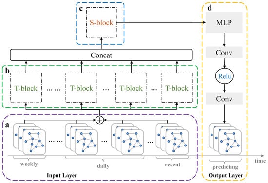 Illustrative architecture of the proposed spatial-temporal diffusion convolutional network (ST-DCN). ST-DCN consists of (a) an input layer, (b) a temporal convolution module, (c) a spatial convolution module, and (d) an output layer.
