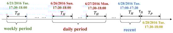 It is necessary to note that in our model: . Because the periodicity of taxi demand will have some fluctuation, it is not strictly periodic []. For example, the peak hours on weekdays usually fluctuate in the afternoon between 17:30 p.m. and 19:30 p.m.