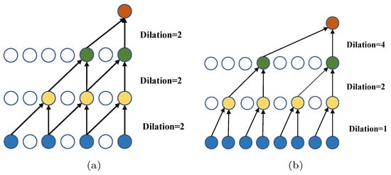 Dilated Causal Convolution: The dilated causal convolution networks can exponentially increase the receptive field by stacking the depth of the network layers. Compared to RNN-based methods, dilated causal convolution networks can tackle long-term sequences in a non-recursive manner, enabling parallel computation and alleviating the gradient explosion issue []. Dilated causal convolutional networks keep the chronological causality sequence by padding zeros to the inputs. This way, it ensures that only historical information is used to predict without leaking any future information. More formally, for a one-dimensional sequence of inputs and the filter , the dilation convolution operation F in the input sequence with element t can be defined as: