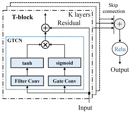 where and are learnable parameters, ⊙ denotes the element-wise multiplication operator, is a sigmoid function, ∗ is the dilated convolution operation. Figure 6 illustrates the structure of Gated TCN.