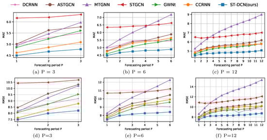 Figure 7 shows the comparison of the forecasting results of various methods as the forecasting time increases. We exclude the results of LSTM since it performs poorly. Overall, as the forecasting time becomes longer, the forecasting becomes more difficult, and therefore the forecasting error becomes larger. As it is shown in the figure, MTGNN performs well compared to STGCN for short-term forecasting. However, when the forecasting time increases, its forecasting accuracy drops dramatically. The errors of the other approaches increase slowly when the forecasting time becomes longer, and their overall performance is relatively good. Our ST-DCN model achieves the best forecasting performance at all forecasting times, and its errors are the smallest and increase the slowest, indicating that our model is highly stable. All of these results suggest the effectiveness of our proposed method for spatiotemporal correlations modelling.