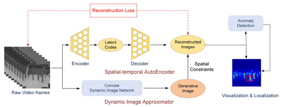 The proposed module consists of the spatiotemporal autoencoder and dynamic image approximator that jointly investigate the representative and image dynamics, as illustrated in Figure 2. Let be a video frame on spatial domain D and temporal domain T, where indicates the pixel coordinates, and indicates the frames in the video sequence. Thus, can be a three-dimensional function on D × T.