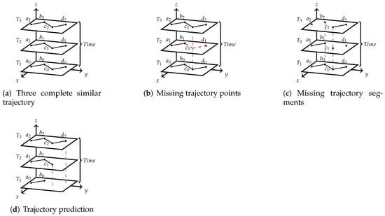 Vehicles trajectory processing category. (a) Analyze of three complete trajectories to determine whether they are similar. (b) Analyze of the similar trajectories at different times to complete the missing trajectory points at a certain time. (c) The similar trajectories at different times are analyzed to complete the missing trajectory segments. (d) The trajectory is predicted by the characteristics of similar trajectory.