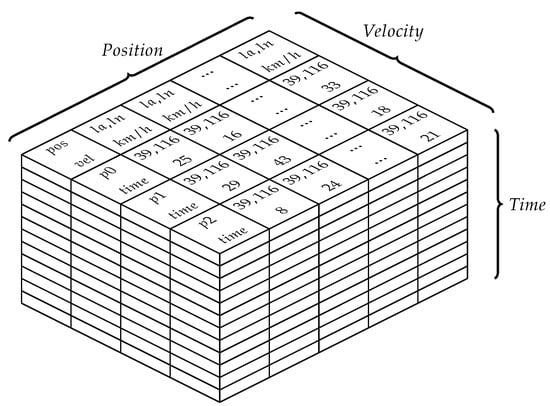 Figure 3 shows the trajectory data cube model, where is trajectory point position, represents trajectory point velocity, is trajectory point time-stamp, each row represents a continuous trajectory segment in unit time, each cube piece represents the information of trajectory points. In this paper, trajectory data cube model will be established in unit of minute according to paper [39].