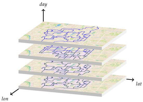 Figure 4 shows the trajectory chart of a vehicle in four days, from which it can be seen that the same path or different paths occurred in four days. The purpose of HTB algorithm is to focus on the similar trajectories that appear in the same time period in different dates, and these trajectories are classified and stored by TDC model. In trajectory data, time information is generally not lost or missing, and what the equipment usually records is the time information when the data is generated (especially the trajectory data collected under the condition of constant frequency). Even in the case of unequal frequency there is still a definite time period. Therefore, the most important information restoration is the position information and velocity information of trajectory points.