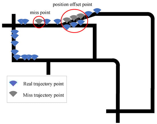 Definition 2 gives the position area of missing data. According to Definition 1, Definition 2 and TDC, the trajectory data information of all lost data in the same time period in history can be obtained. The information related to missing data is extracted hierarchically from TDC. Figure 5 shows the examples of missing position information and position offset of trajectory points.