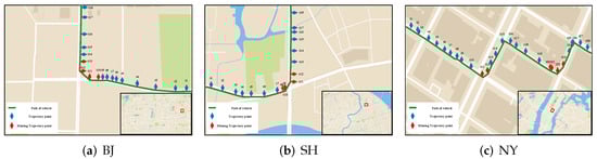 Sample trajectory selection of three datasets. (a) Taxi trajectory selection in Beijing city. (b) Taxi trajectory selection in Shanghai city. (c) Taxi trajectory selection in New York city.
